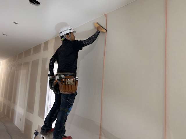 壁にクロス(壁紙)を貼って仕上げていきます。